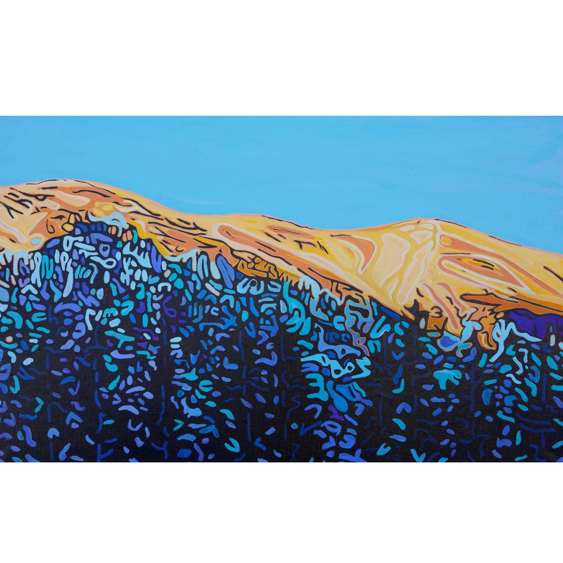 After a day out hiking in the mountains, one tends to spend the evening relaxing and planning the next adventure. You sometimes need to be reminded that a stroll outside during the golden hour can bring about some mesmerizing scenes. On one particular summer evening, we took the opportunity to go for a walk and were rewarded with the sun setting on the exposed rock of Grotto Mountain. This painting tries to capture the scene of the top of Grotto mountain lit up by the late evening sunrays while the trees below were already shaded by the mountains to the west.
