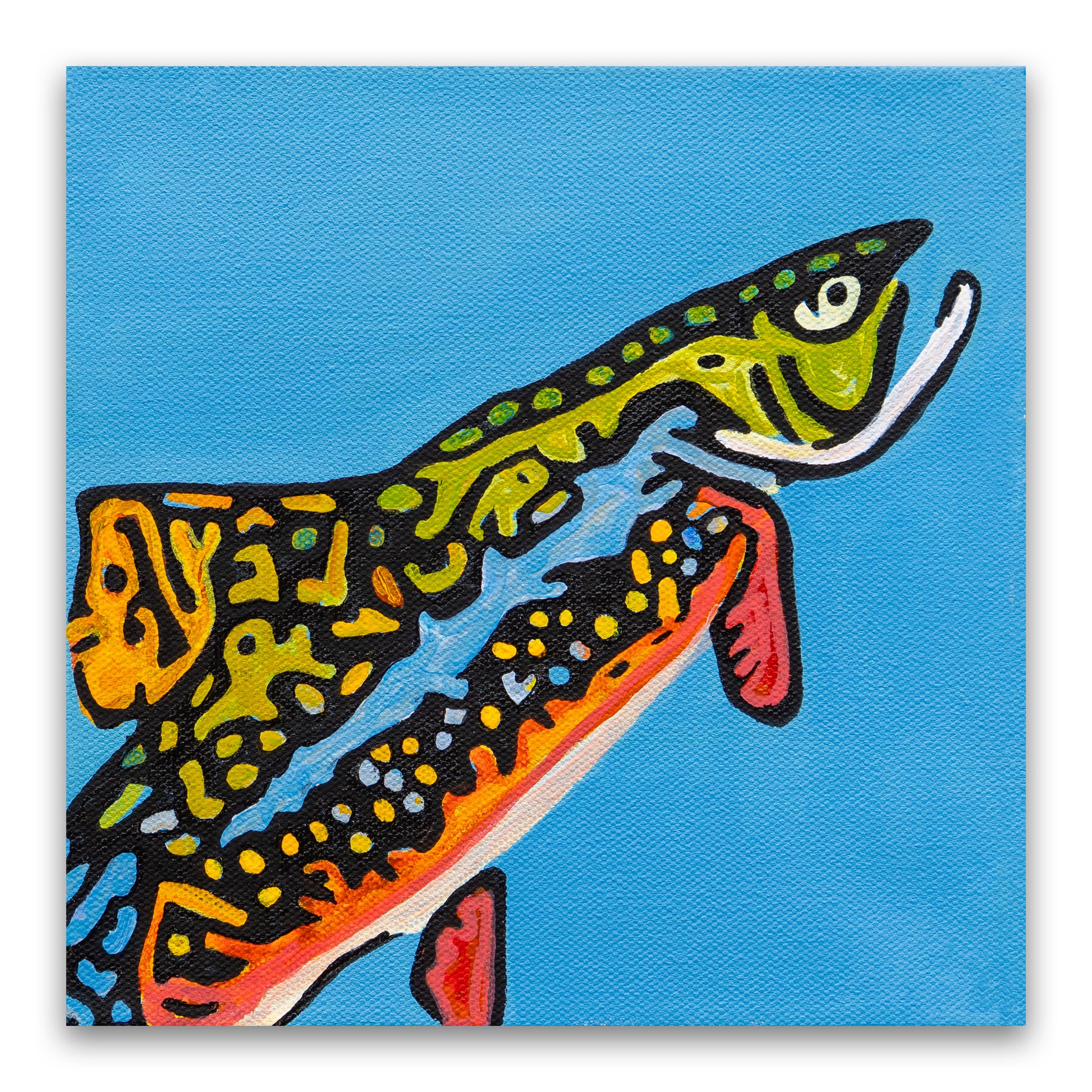 "Long Tall Sally" captures the vibrant elegance of a brook trout rendered in dynamic, expressive detail against a serene light blue background. The fish stretches diagonally in the composition, its elongated body emphasizing the painting’s title with a playful nod to personality. Shimmering hues of olive green, coppery orange, and iridescent gold ripple across its flank, interrupted by the iconic constellation of pale vermilion spots haloed in blue. The delicate fin structure, particularly the deep red of the lower fins edged in milky white, is rendered with fine, almost translucent brushwork that contrasts with the more fluid, gestural lines along the trout’s back. The background’s gentle blue suggests a crisp alpine stream or clear mountain sky, placing the fish in a space that feels both natural and dreamlike. Altogether, the painting feels like a tribute—bold, graceful, and full of motion.