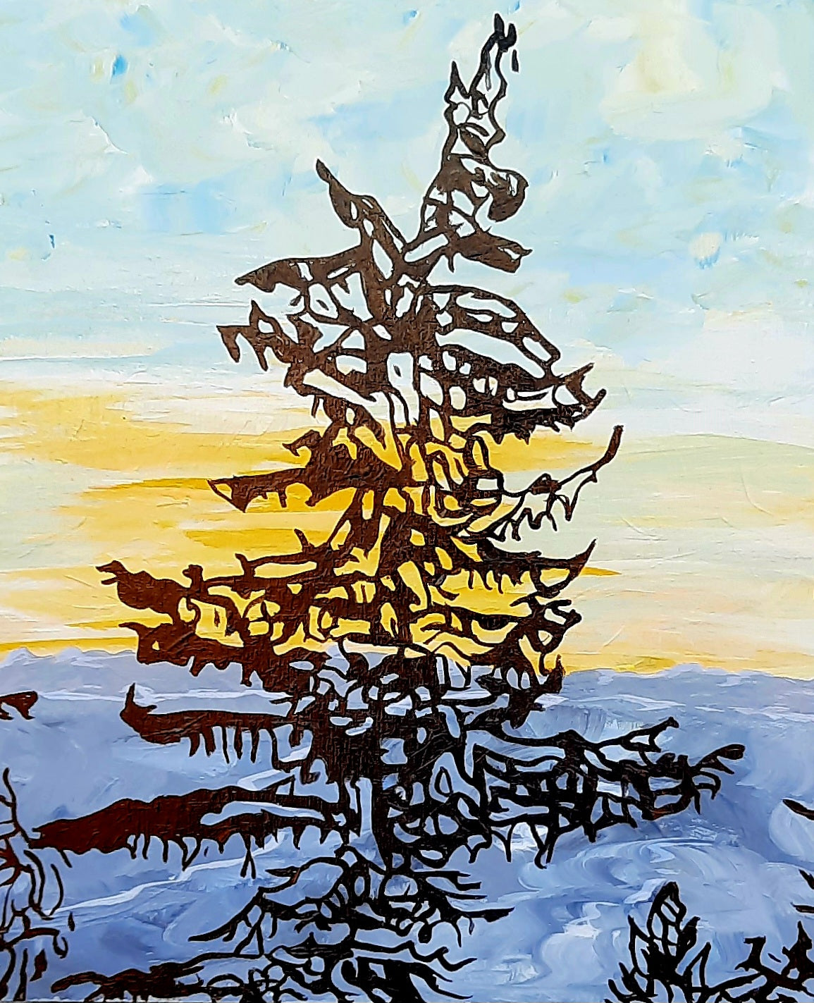 Perched stoically upon the rugged cliff's edge, a lone spruce tree stands as a solitary sentinel against the vast expanse of sky. Its sturdy trunk, weathered by the elements, reaches skyward with an air of quiet resilience, while its branches stretch outward in a graceful canopy as if embracing the heavens above. Against the backdrop of the soft-coloured sky, painted in delicate hues of peach and lilac, the silhouette of the spruce tree emerges with striking clarity, its dark green needles casting a stark contrast against the gentle pastels. Below, the cliff drops precipitously into the churning sea, where waves crash against the rocks with a rhythmic cadence, echoing the heartbeat of the earth itself. In this solitary sanctuary, where land meets sky in a harmonious convergence, the lone spruce tree stands as a symbol of strength and solitude, a silent witness to the ever-changing tapestry of the natural world.